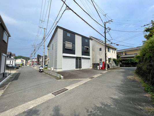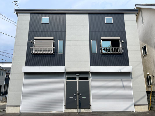 建物外観はツートンカラーがオシャレなキューブ型の2戸物件。