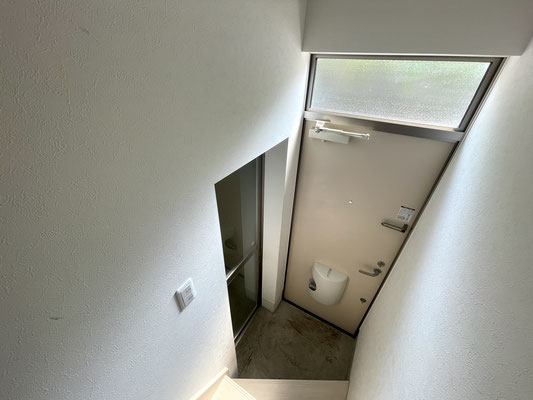 廊下の突き当りのトイレは開閉可能な小窓付きで嬉しいね〜