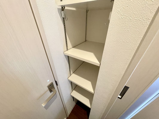 扉のすぐ近くには収納だってあるから買置きだって置けるし、掃除道具も収納出来ますね♪