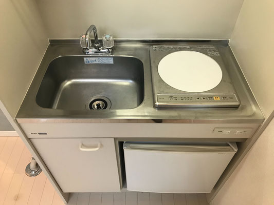 お掃除のしやすいIHコンロです。 コンロの下は備え付けのミニ冷蔵庫です。
