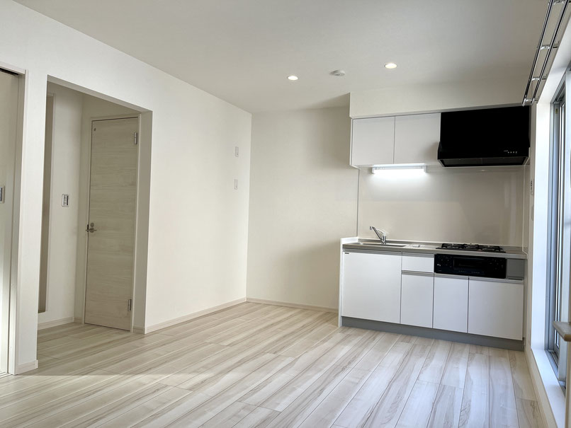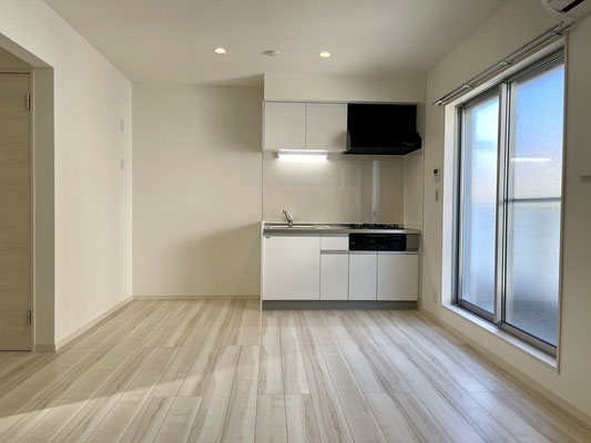 お部屋の中には可愛い白のシステムキッチン。