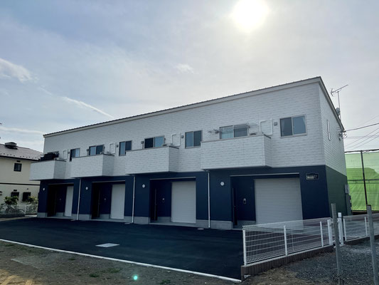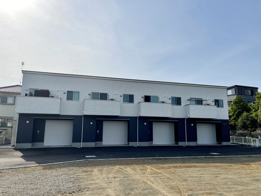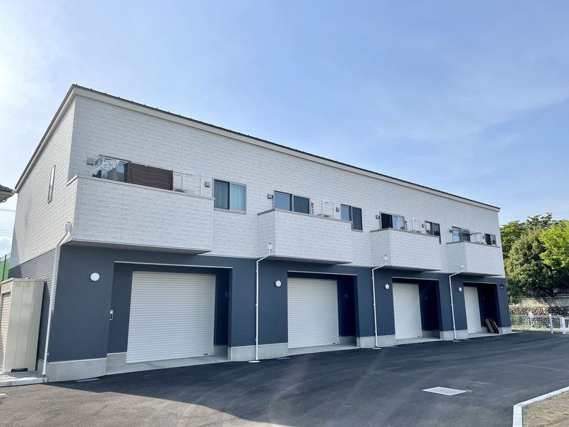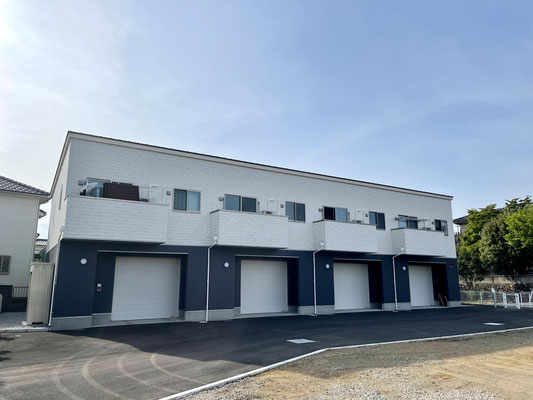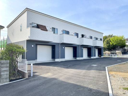 建物外観は1階と2階の塗り分けがオシャレなキューブ型の連棟式住宅。