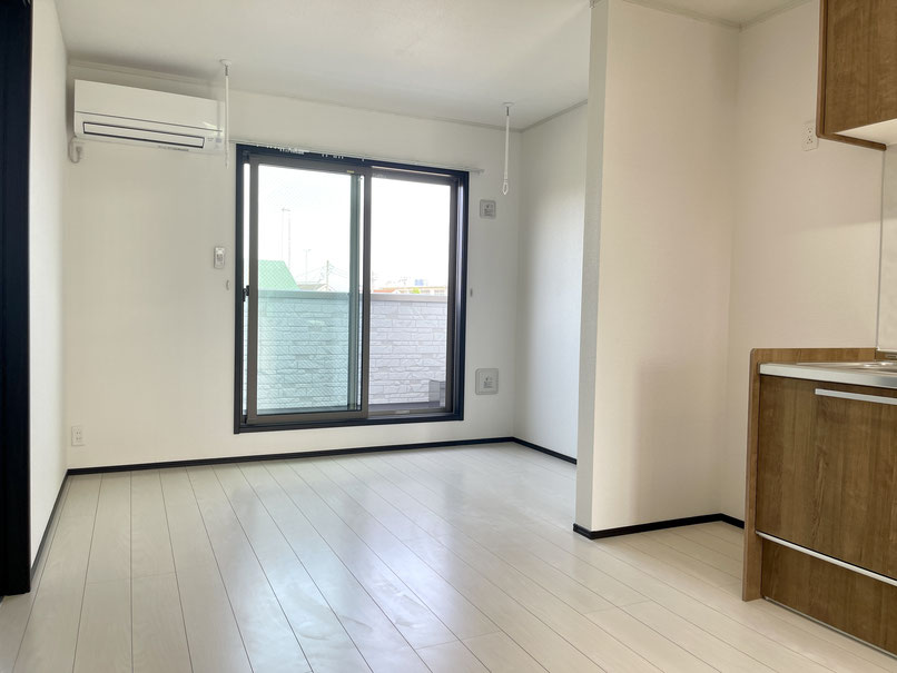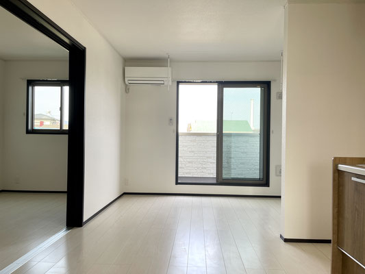 お部屋の突き当りには掃き出し窓があり、バルコニーと繋がっています。