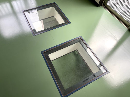 床にはガレージが見渡せる強化ガラスの窓が2つ♪