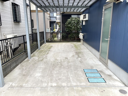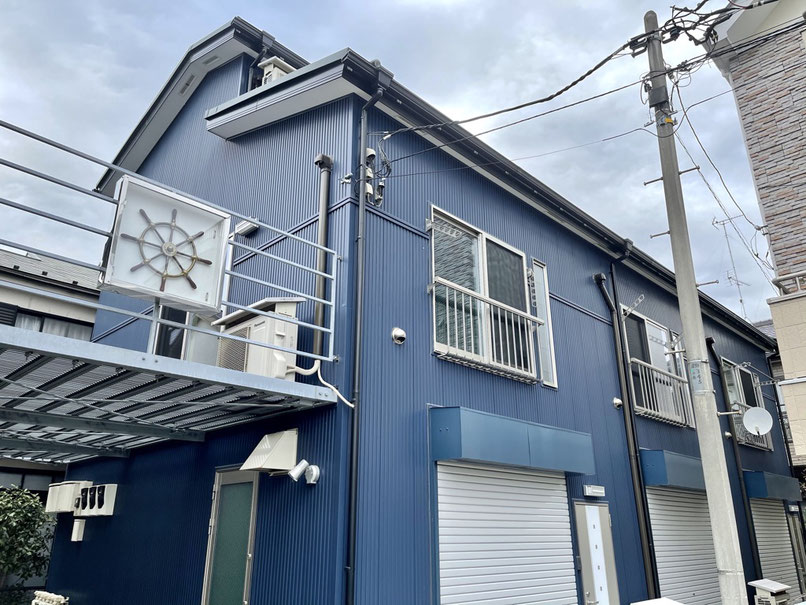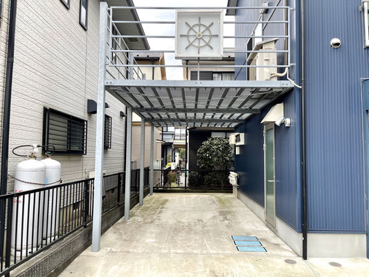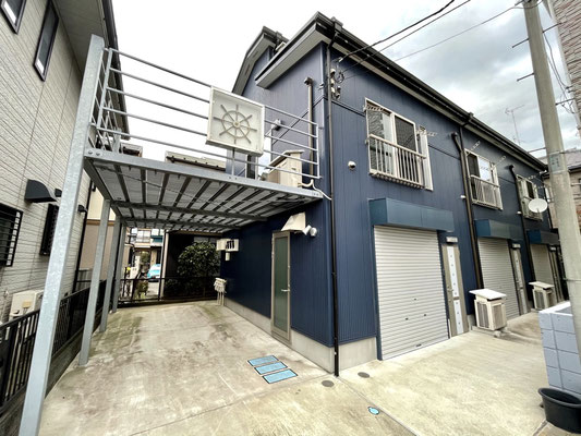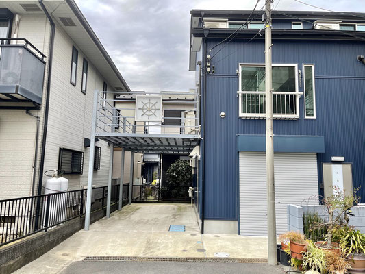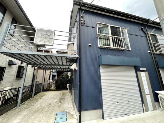 建物外観は紺色のガルバリウム壁とカーポートのような駐車場が印象的。