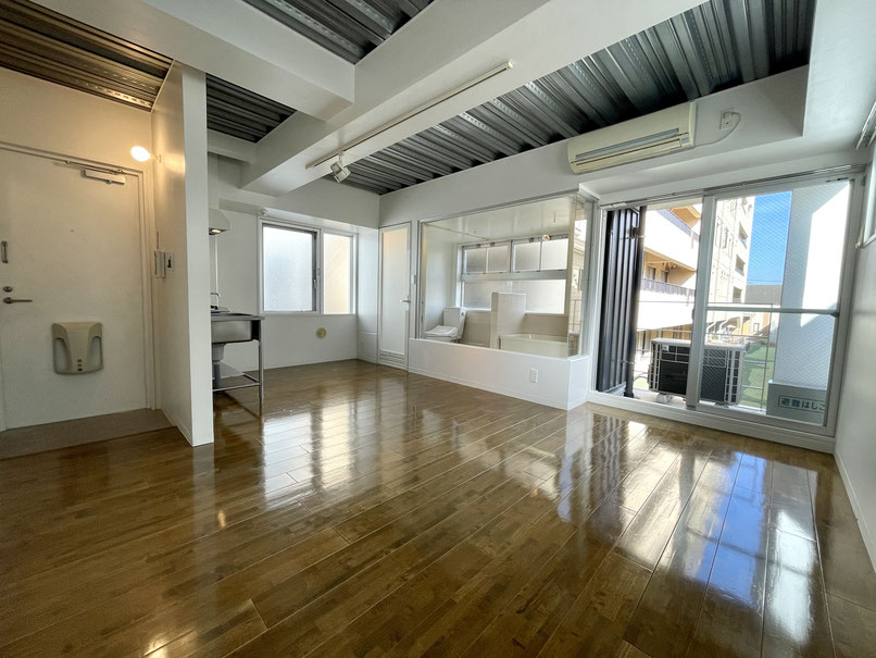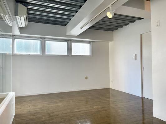 暗めのフローリング床と白の壁、天井の剥き出し鉄板がいい雰囲気ですね〜