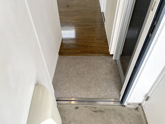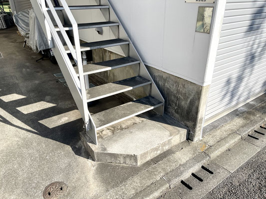 玄関は建物横にある階段を使って2階に登った所にあります。