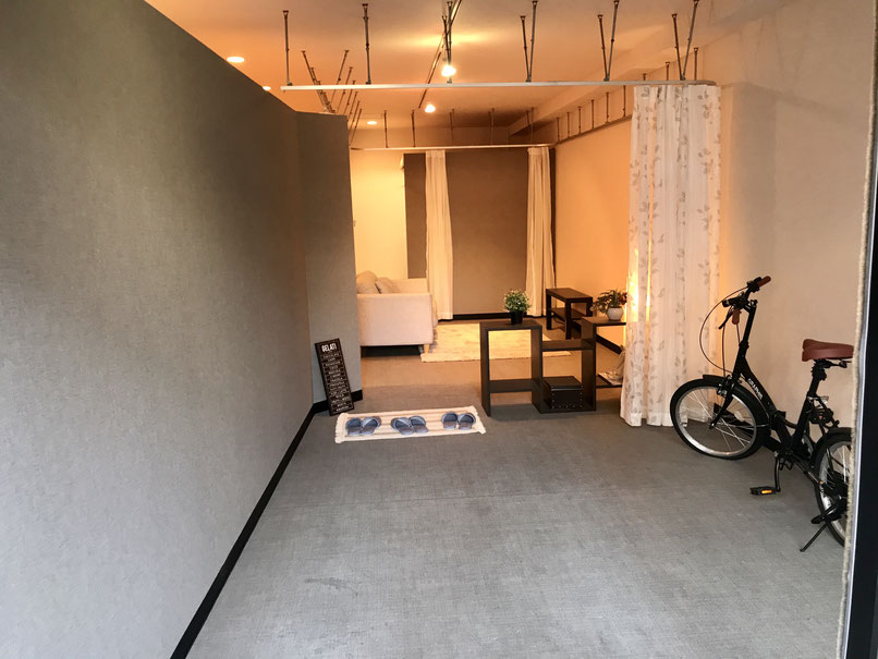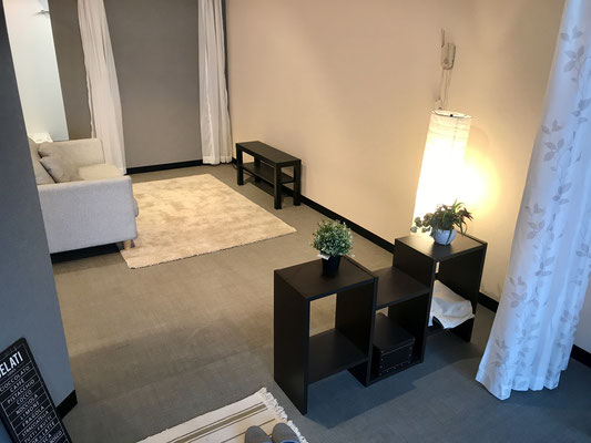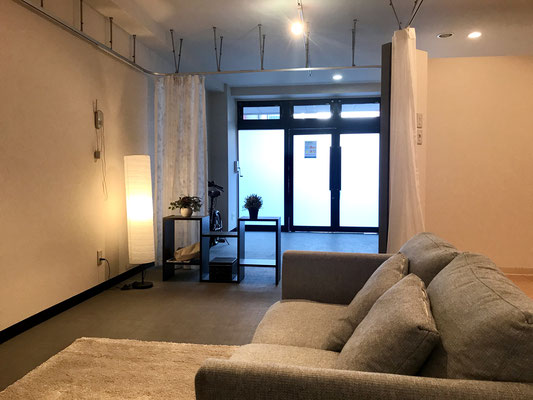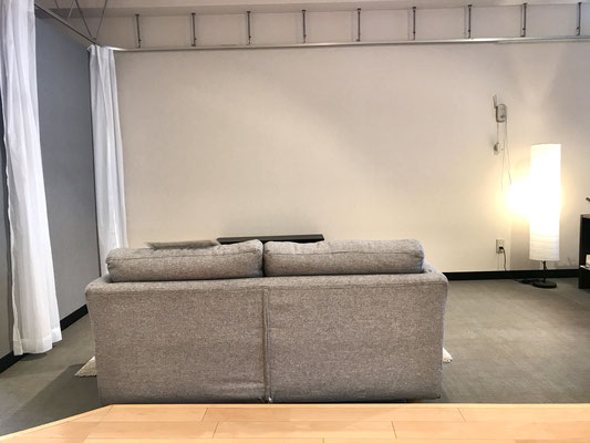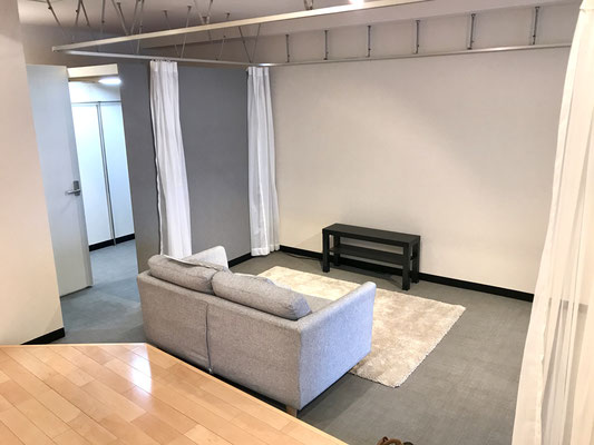 カーテンを利用した間仕切りでまるで巨大な1ルームのような作り。