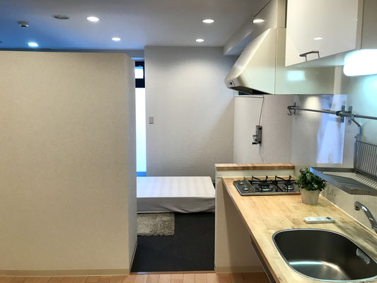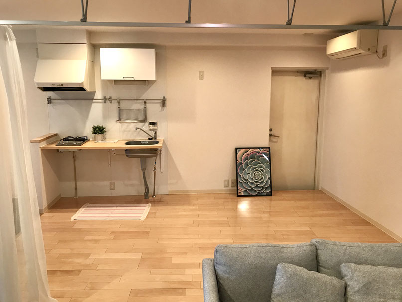 間取り的には1LDKとなっていますが、部屋と部屋の仕切りは天井付近が空いているパーテーションや
