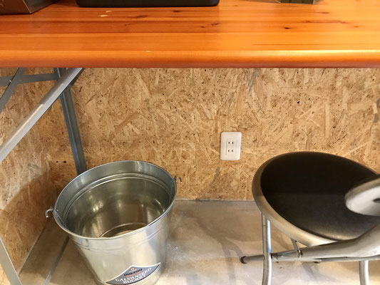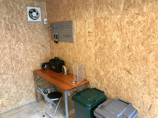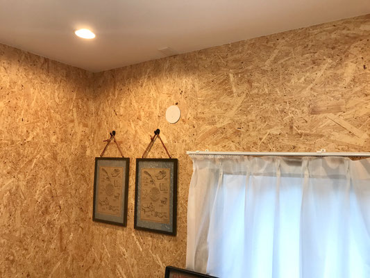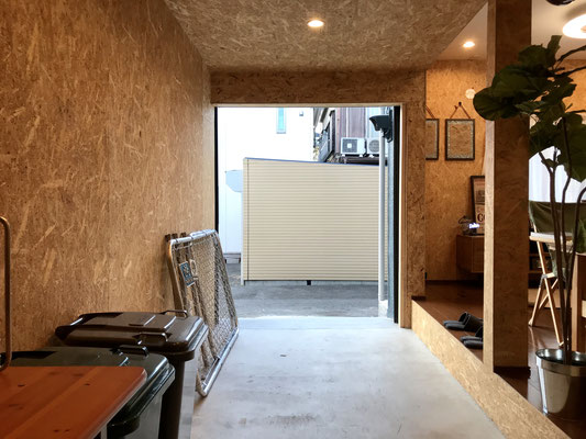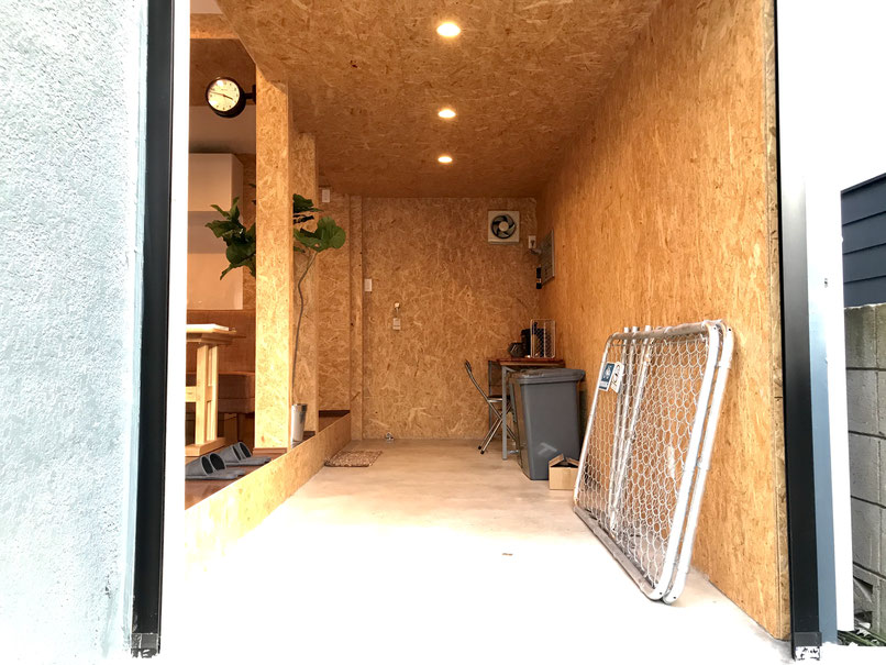 OSB合板の壁で囲まれたガレージは木の温もりが感じられる気持ちの良い空間です♪