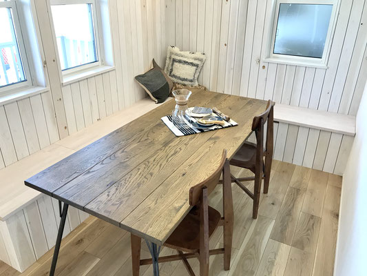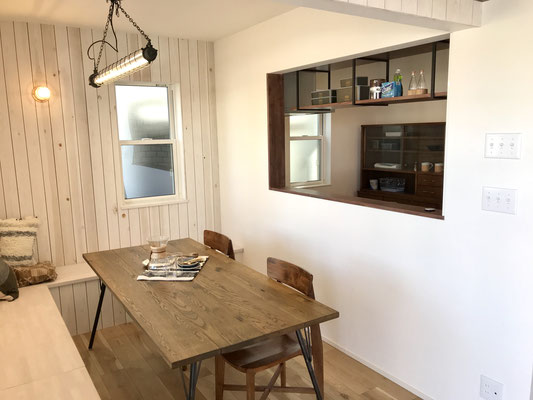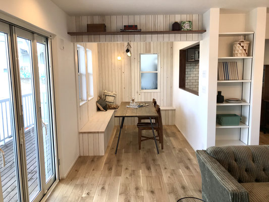 ダイニングスペースには収納付きのベンチもあります♪