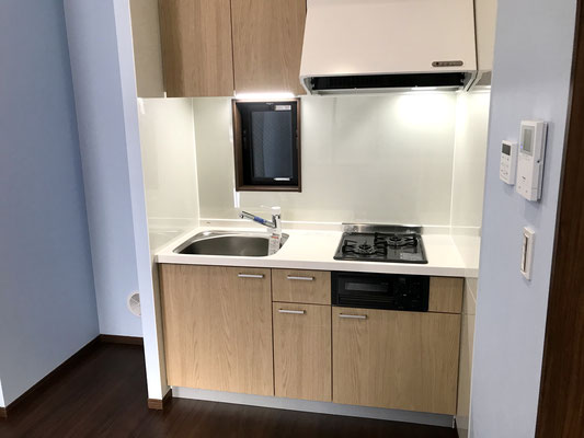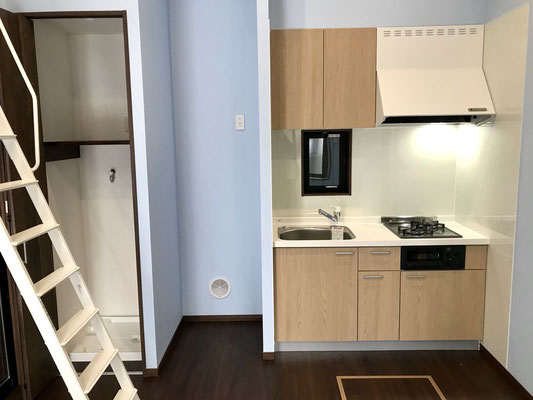 お部屋に入ってまず目につくのが小型ながらも使いやすそうなキッチン。