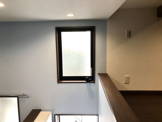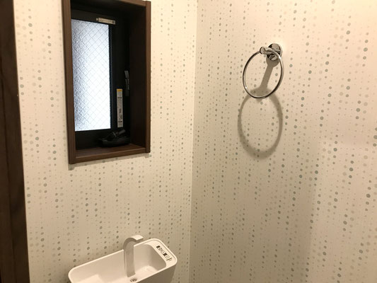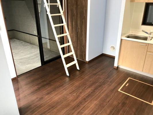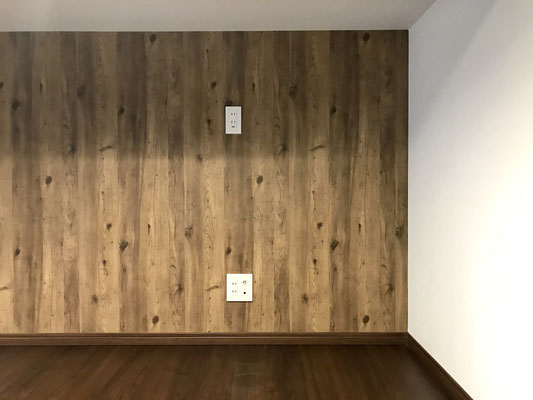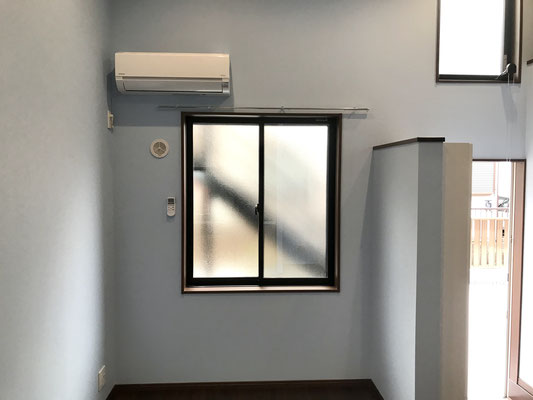 水色の爽やかな壁紙と濃いめのフローリング床が良いですね〜