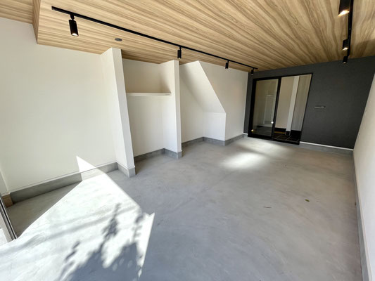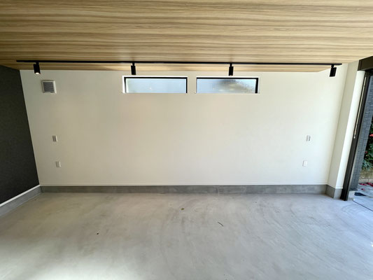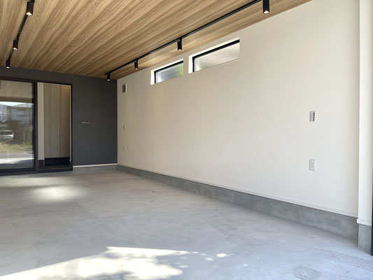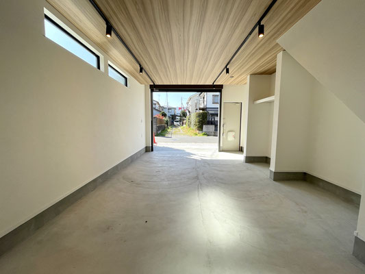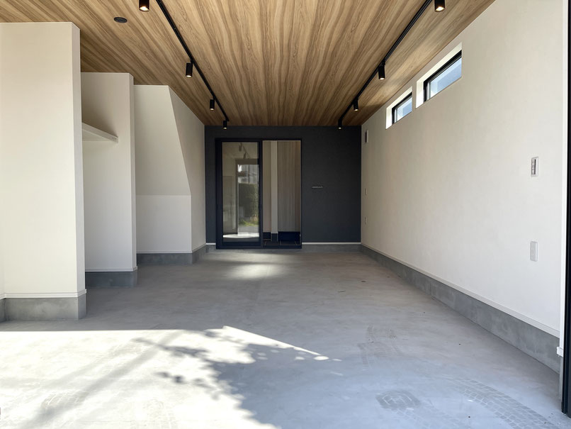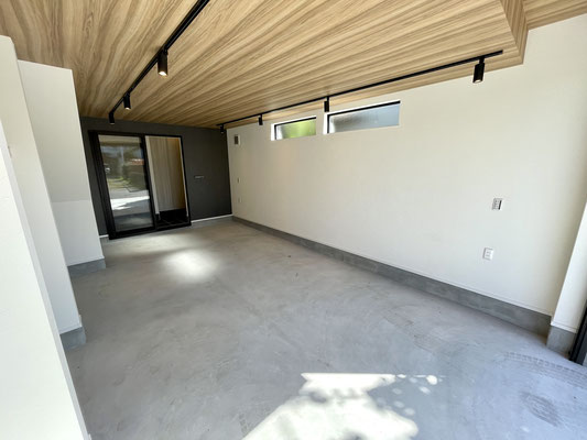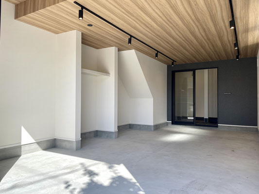 奥行きがあるガレージはウッド調の天井と奥のアクセントクロスが特徴的な居心地の良い空間。