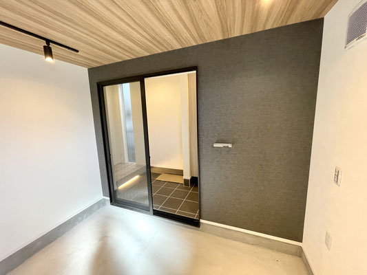 ガレージの奥には大きなガラスのスライドドアがあり居室にアプローチ出来ます。