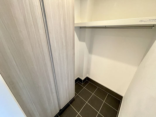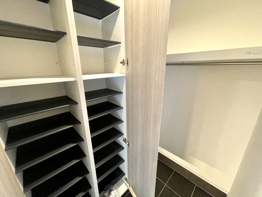 下駄箱収納も大型で大容量だし、その奥にもハンガーラック付きの収納。