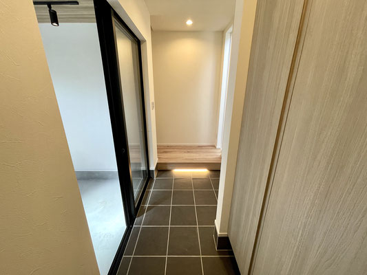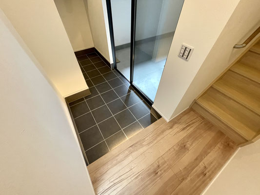 中に入ると黒タイルの玄関床がガレージとの空間分けになっていて落ち着いた雰囲気。