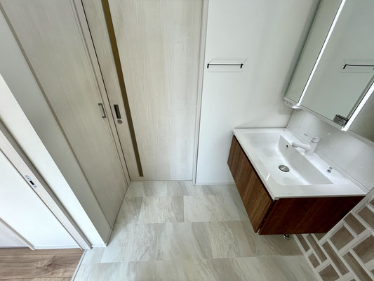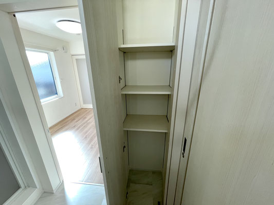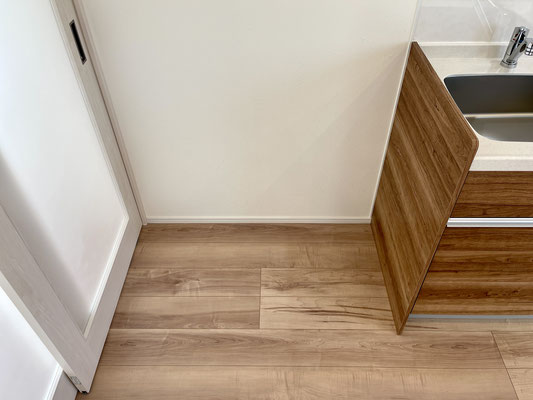 ここにも扉付きの収納があるので、タオルやトイレットペーパーの買い置き、洗剤の買い置きなど