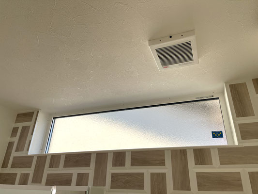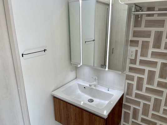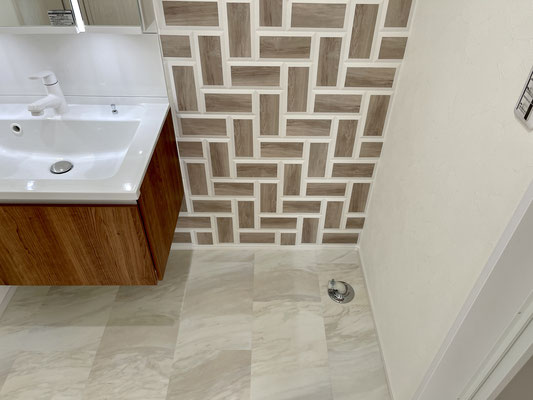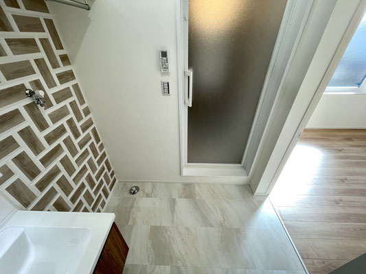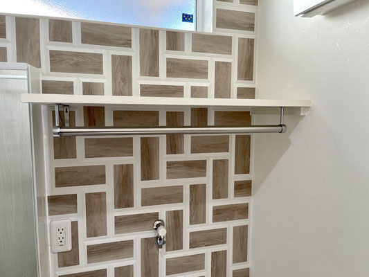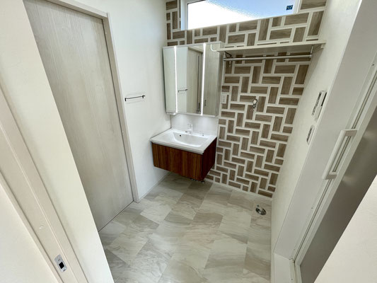 オシャレな壁はウッドタイル調で上部にはFIX窓もあり、明るい雰囲気の脱衣所〜