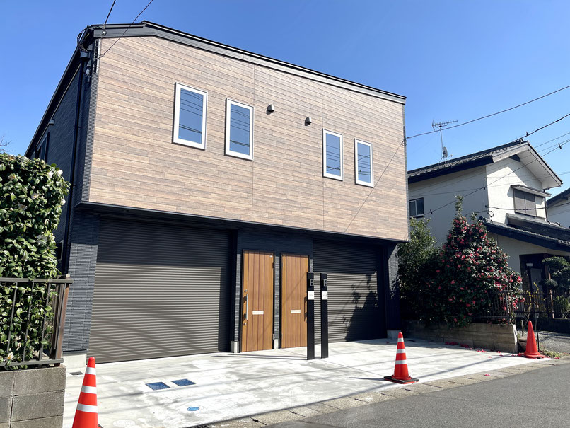 建物外観はブラックとウッド調のサイディングで変形片流れ屋根が特長的な2戸物件。