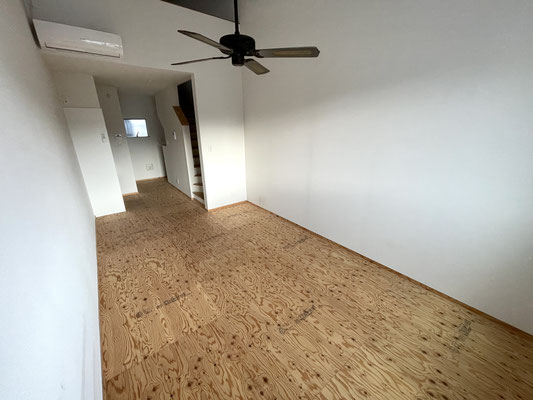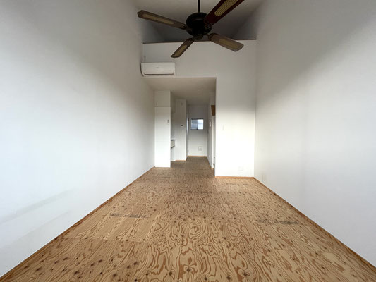 縦に長いお部屋だから出入り口付近はガレージとして使って、奥側を生活空間として分けられますね〜