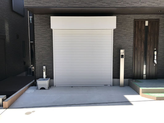 爽やかな白の電動シャッターを開けるとそこにはビルトインガレージ!