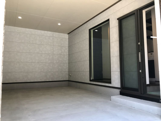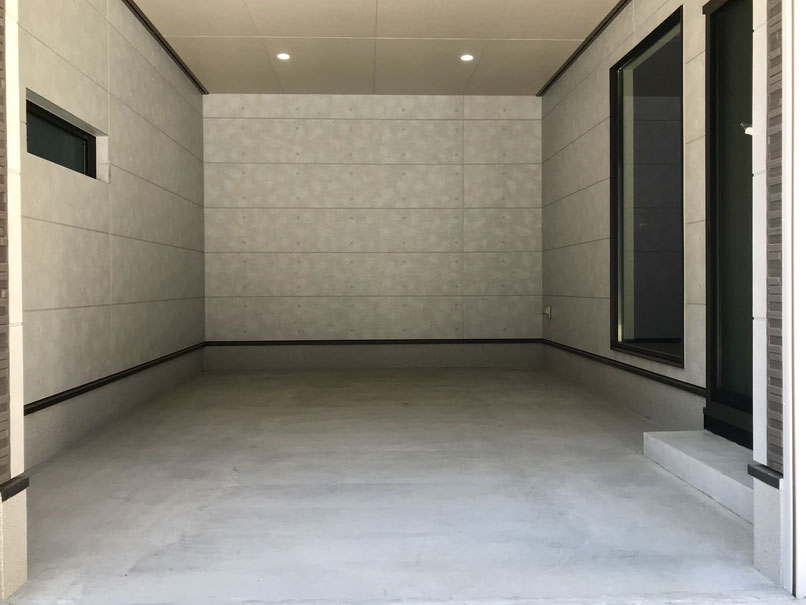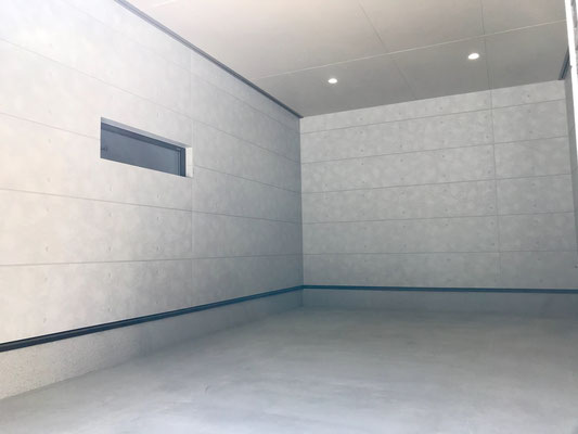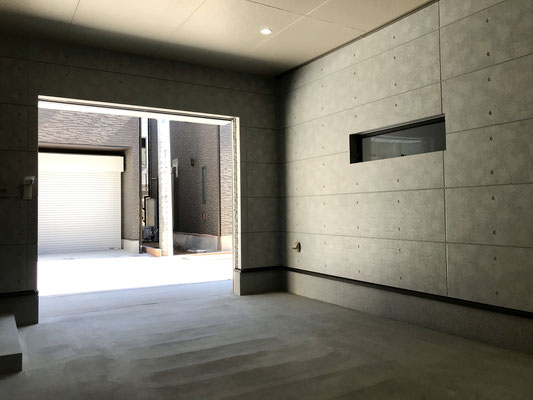 コンクリート調のガレージは天井も高く、換気の為の窓や埋め込み式のダウンライトもあり