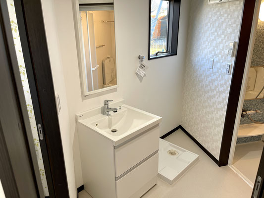 シンプルな独立洗面台と洗濯機置場付きの脱衣所です。