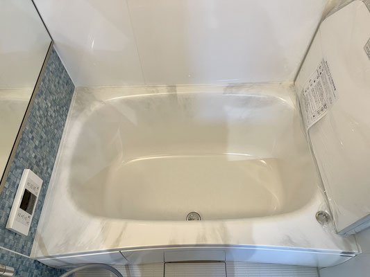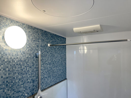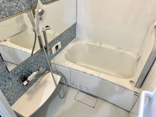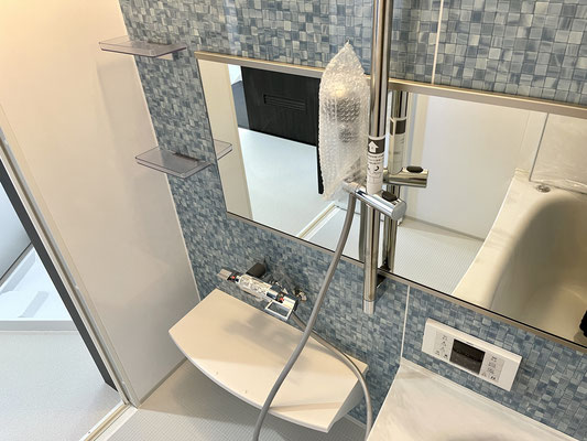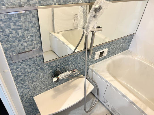 ブルー系のモザイクタイル調が爽やかなバスルームです。