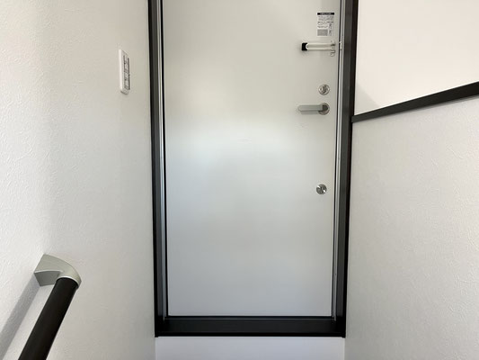 玄関はガレージシャッターがある面の横にあります。