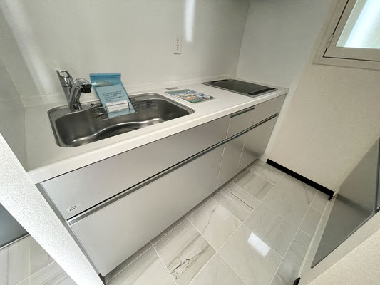 お手入れのしやすいIHコンロや食器棚も付いたキッチンスペースは白とシルバーで統一!!