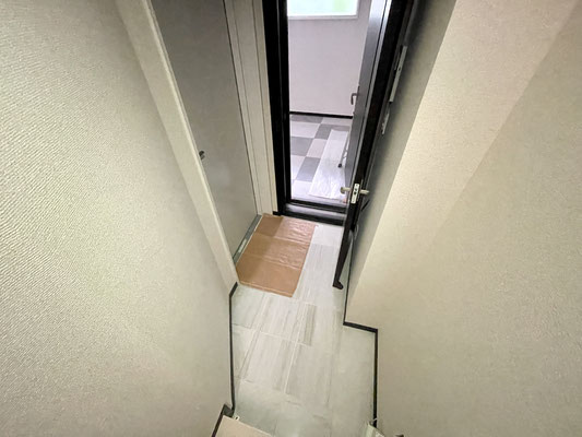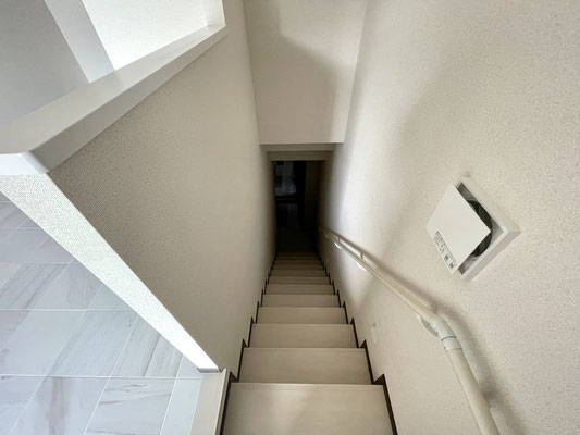 階段は広く、雨の日も滑りにくそうな床材を使用!