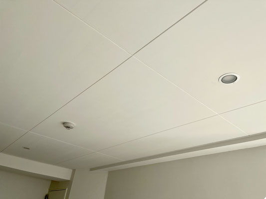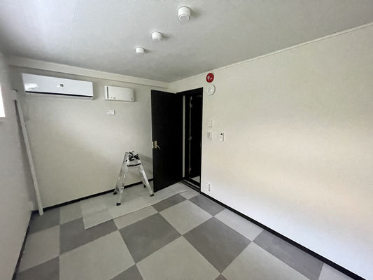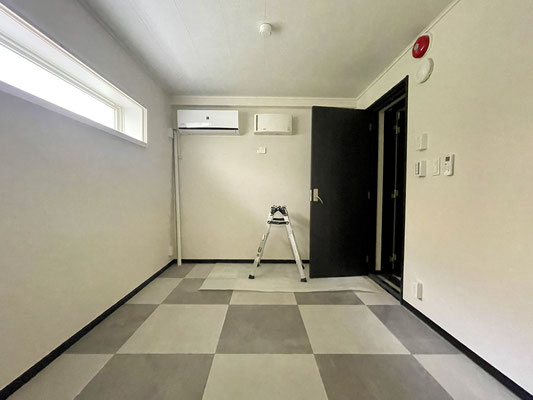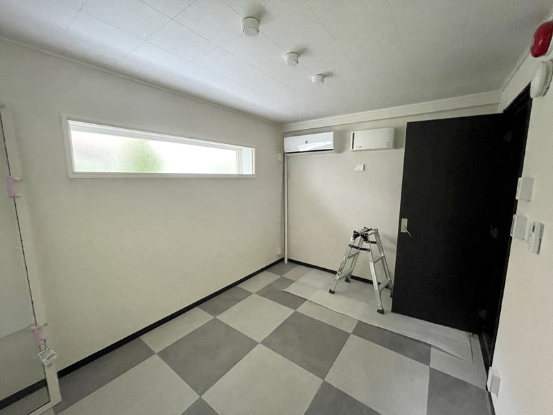 床のパターンはチェッカー模様になっており、天井には3連の照明器具が設置済。
