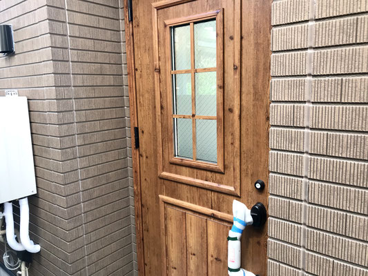 外壁にマッチした可愛いウッド調ドア〜