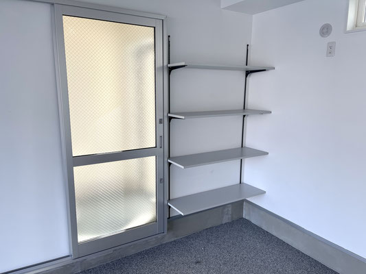他にもガレージ内には玄関スペースに通じているスライドドア、水栓、高さ調節が可能な棚、
