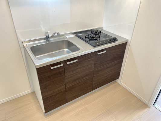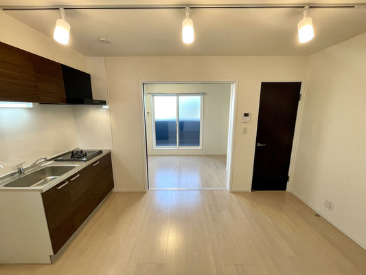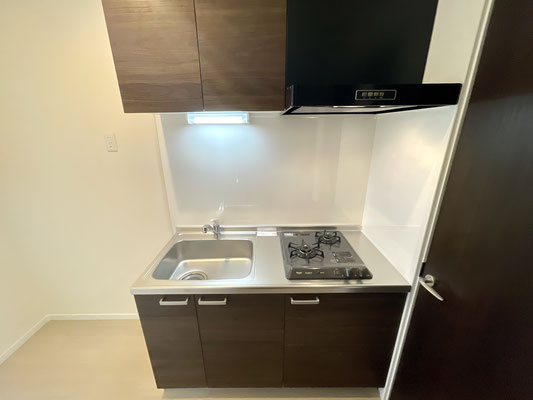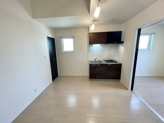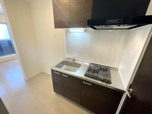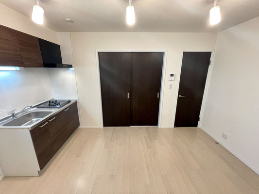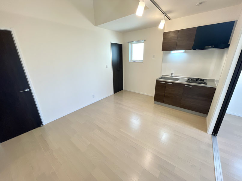 こちらも爽やかな白系のフローリングと焦げ茶色のキッチンが特徴的なお部屋です。