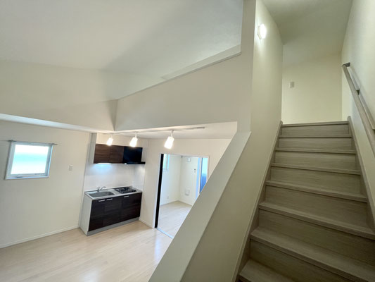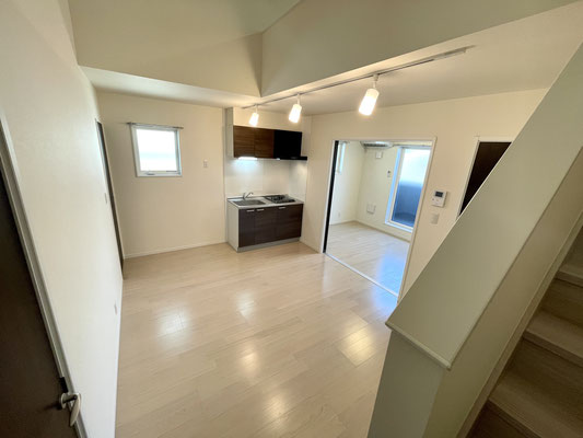 階段を登って扉を開けると34.15㎡ 7.87帖のDKスペースがあります。