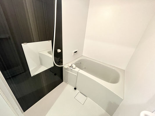 追い焚き機能や浴室暖房乾燥機付きのバスルームは壁の一部が高級感がある焦げ茶色。