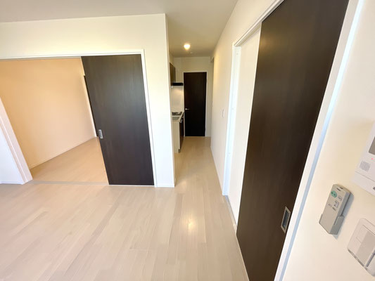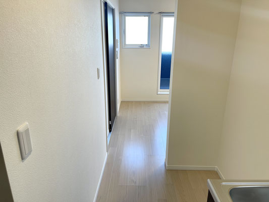 爽やかな白系のフローリングと廊下に設置されたキッチンが特徴的なお部屋です。