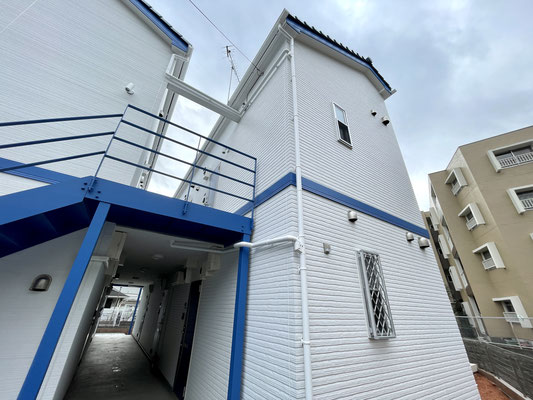 建物外観はホワイトを基調として差し色のブルーが入った爽やかな印象の建物です。