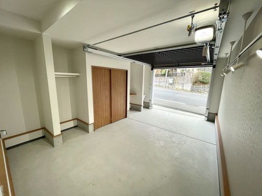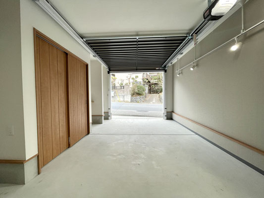 大切な愛車が余裕をもって駐車出来るサイズ感のガレージは設備や収納も盛り沢山♪