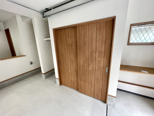 ガレージ奥には特長的なブルーの扉、ガレージ出入り口があります。