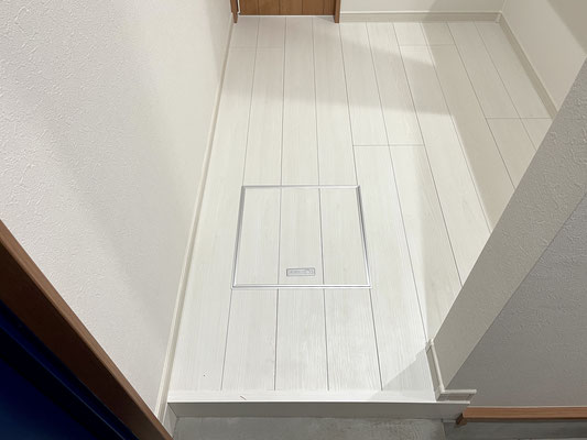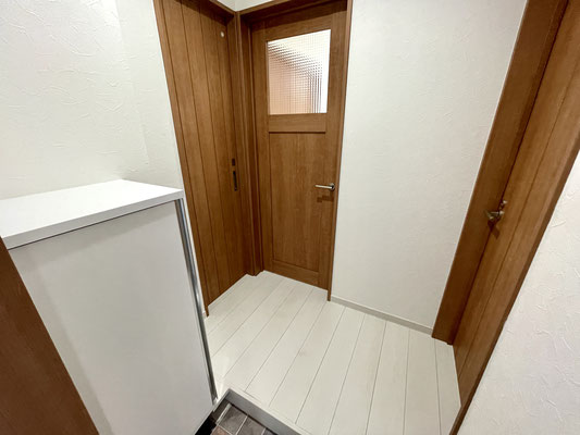 中に入ると小さめの下駄箱収納と落ち着く色合いの3つの扉が出迎えてくれます。