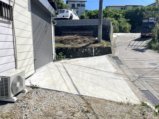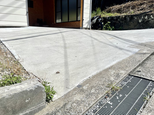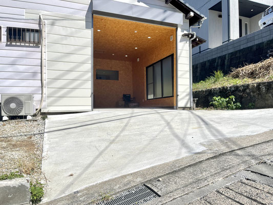 ガレージの入り口は段差など無くフラットですが、物件が坂の中腹にあるため多少のスロープがあります。