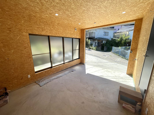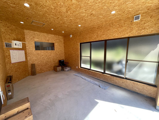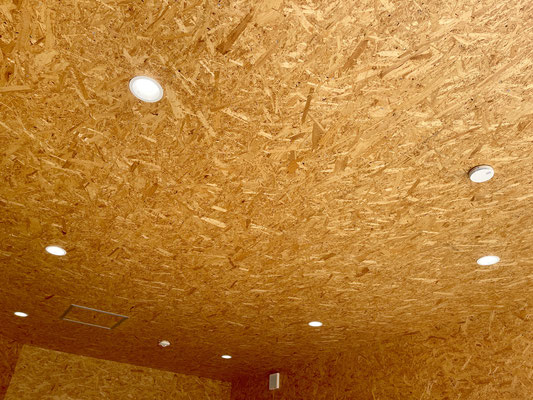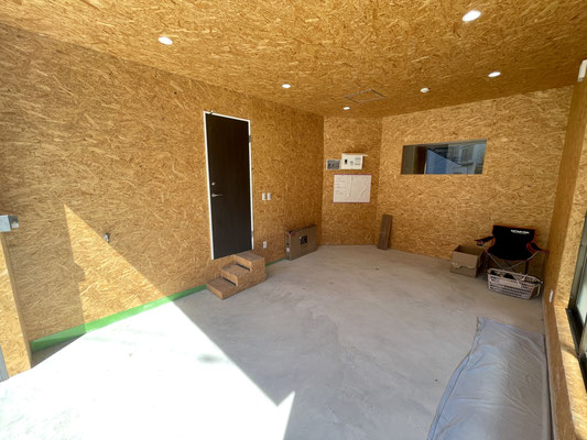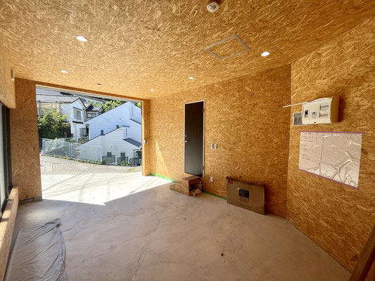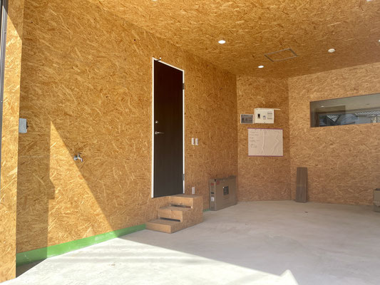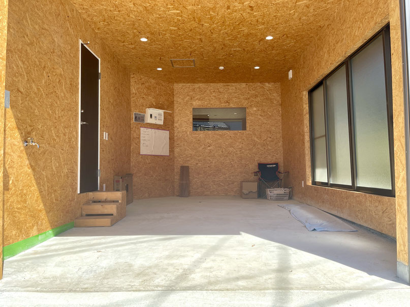 床や天井に貼られたOSB合板が特徴的なガレージはホビースペースとしても活用出来ます♪