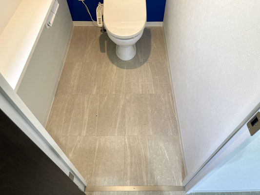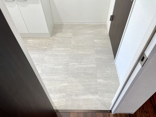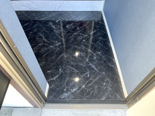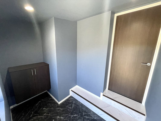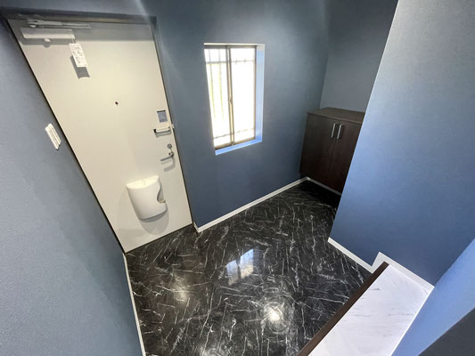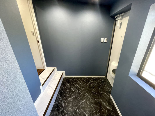 中は黒大理石調の三和土やライトブルーの壁で一気に雰囲気が変わります。
