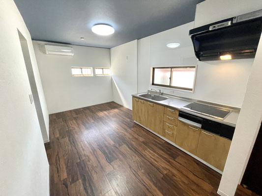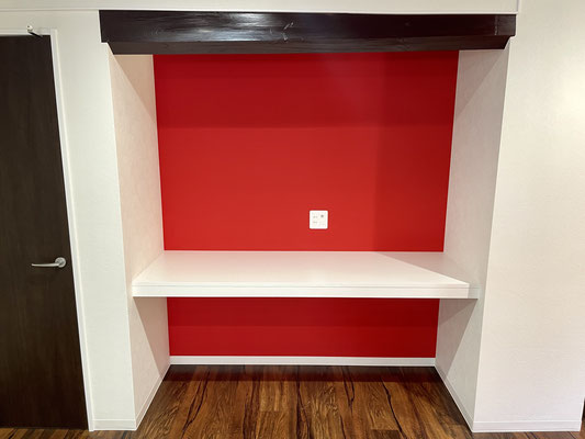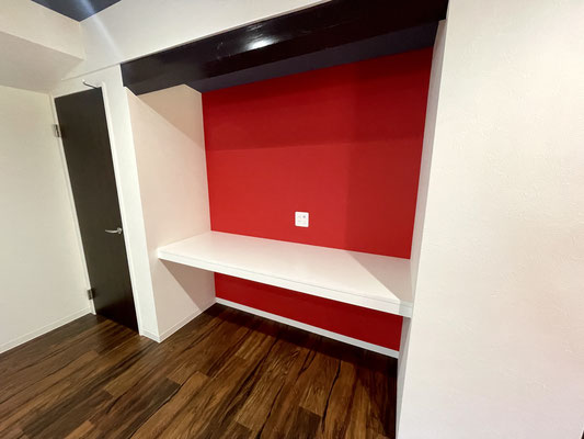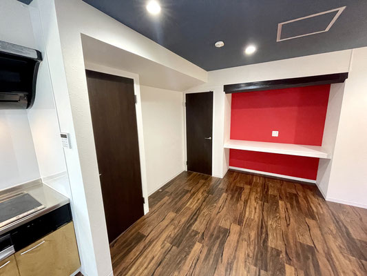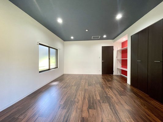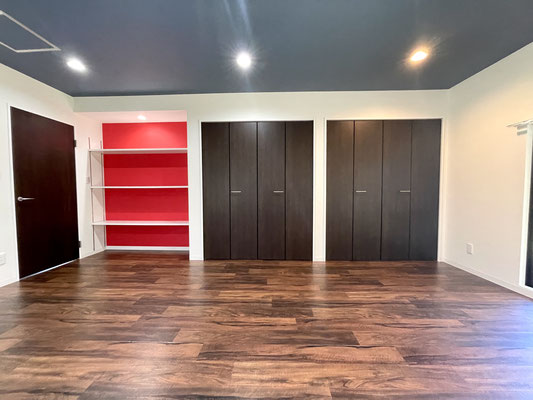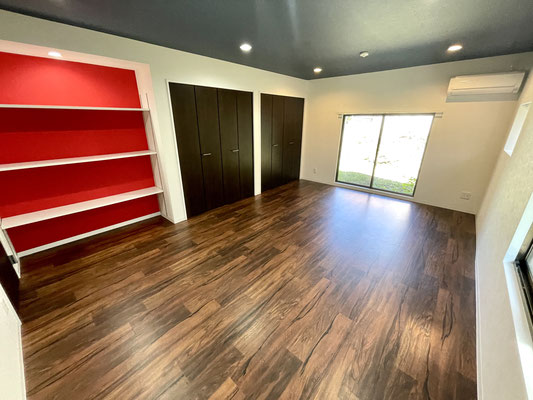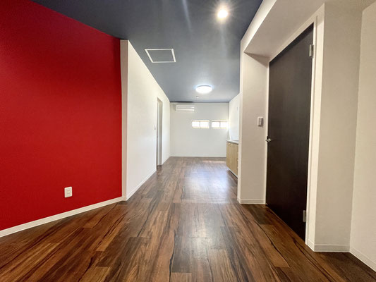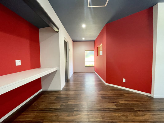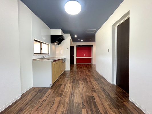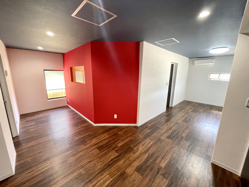 ちょうどガレージを囲むようにL字型に配置されたLDKは真っ赤なアクセントクロスが特徴的なお部屋です。