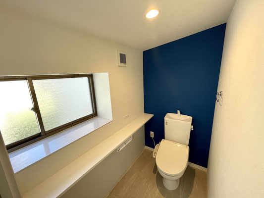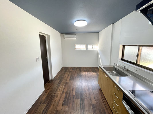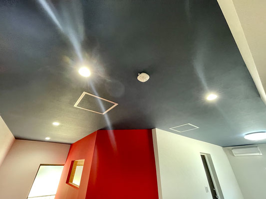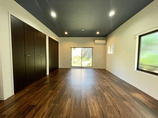 こちらの天井もLDK同様に埋込み型のダウンライトとブルーグレーのクロスで落ち着く空間。