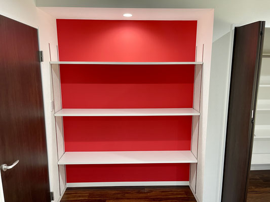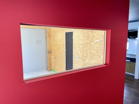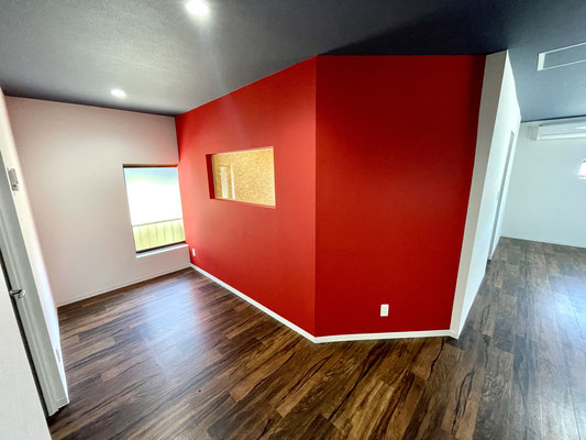 真っ赤なアクセントクロスにはガレージが見渡せるFIX窓。