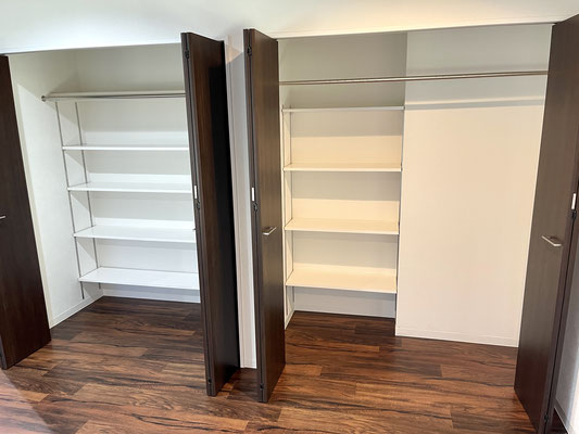 壁の一方はクローゼットや収納棚が並び収納力も抜群のお部屋〜